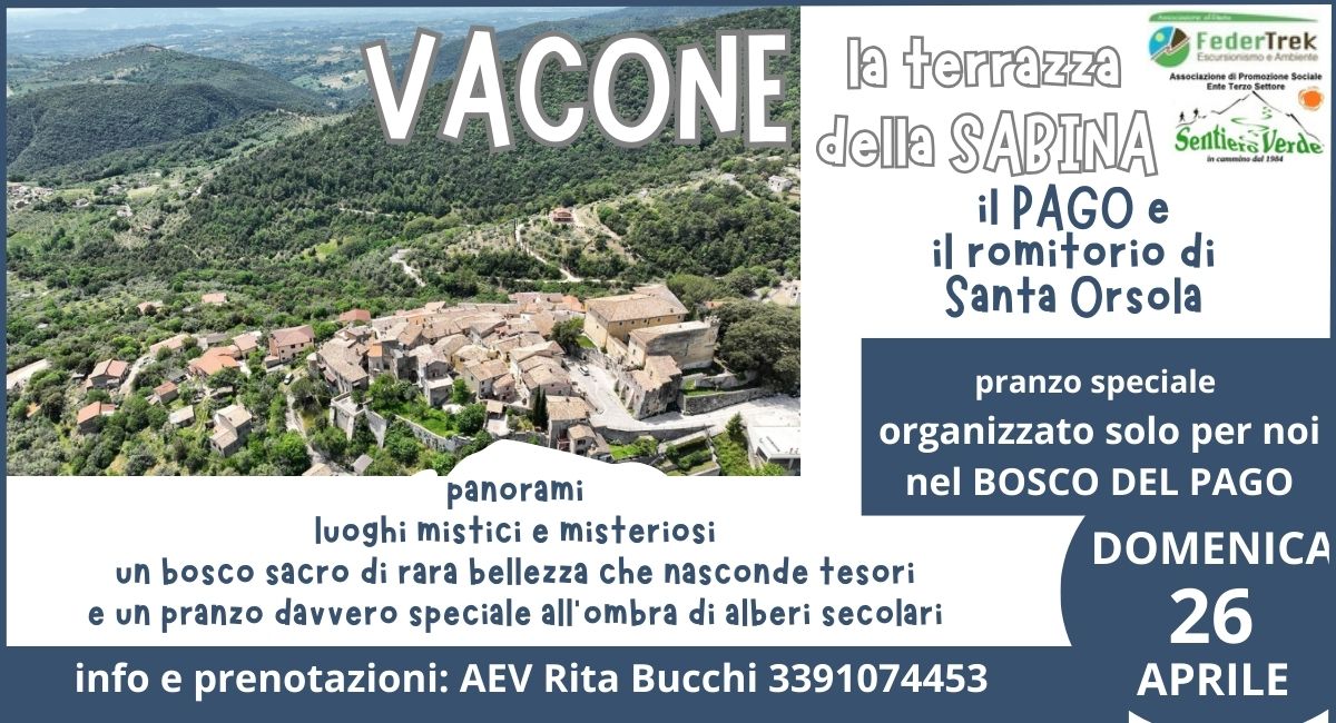 Partiamo da Vacone, vi lascio immaginare il panorama se da tutti è chiamata la “terrazza della Sabina”. Ma non ci accontentiamo, e saliamo fino al suggestivo romitorio di Santa Orsola, sulle pendici del Monte Cosce. Il panorama è sempre più spettacolare! I luoghi sono magici e pieni di mistero e misticismo! Tornando a valle percorriamo l’anello intorno al bosco del Pago, carico di energia e dalla natura sorprendente, un bosco incantato di lecci e corbezzoli, non a caso era il bosco sacro alla Dea Vacuna, antica divinità sabina, e quì passeggiava Orazio, il sommo poeta latino, tessendo le lodi della fonte Bandusia, e qui pranzeremo, circondati da alberi secolari. Inconsueto ristorante per un giorno, il Pago ci ospiterà per un pranzo davvero speciale!!!