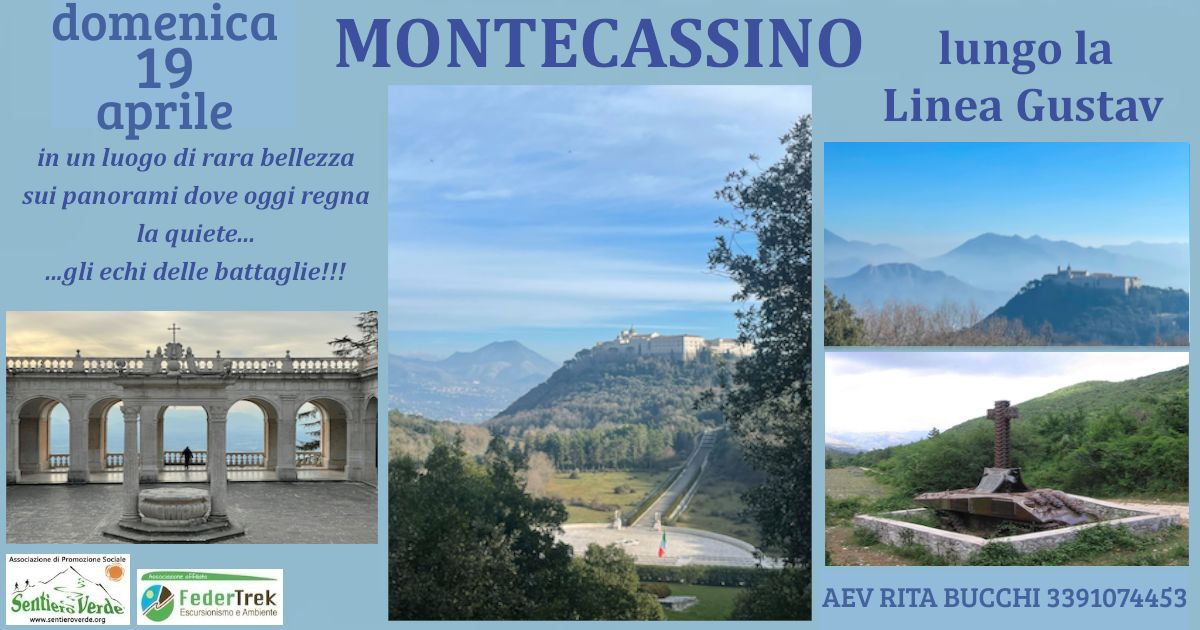 Una camminata davvero emozionante, in luoghi di rara bellezza, con affacci su panorami che lasciano vagare lo sguardo lontano su montagne che all’orizzonte si susseguono ad altre montagne e lasciano spazio all’immaginazione, che purtroppo fu dura realtà, lasciandoci percepire l’eco delle battaglie che qui si combatterono con estrema violenza durante la seconda guerra mondiale: siamo a Montecassino che subì uno dei bombardamenti più intensi….Ora la quiete regna sovrana sui ricordi e su tanta bellezza che la natura ci ripropone togliendoci il fiato mentre camminiamo lungo quella che fu la linea Gustav, su quelle colline e quegli affacci che in tempo di guerra diventavano numeri, come la collina 593 dove ora un grande obelisco ricorda i soldati che hanno combattuto. Percorreremo la Cavendish Road costruita appositamente tra le montagne per far arrivare i rifornimenti, ci imbatteremo nella casa del dottore, dove venivano portati i feriti, anche un vecchio carrarmato lungo la via……tracce, che restano, come cicatrici, a ricordarci l’atrocità della guerra, di qualsiasi guerra!!! Al ritorno la visita all’abbazia voluta da San Benedetto, completamente ricostruita, sarà uno spettacolo indimenticabile!!!