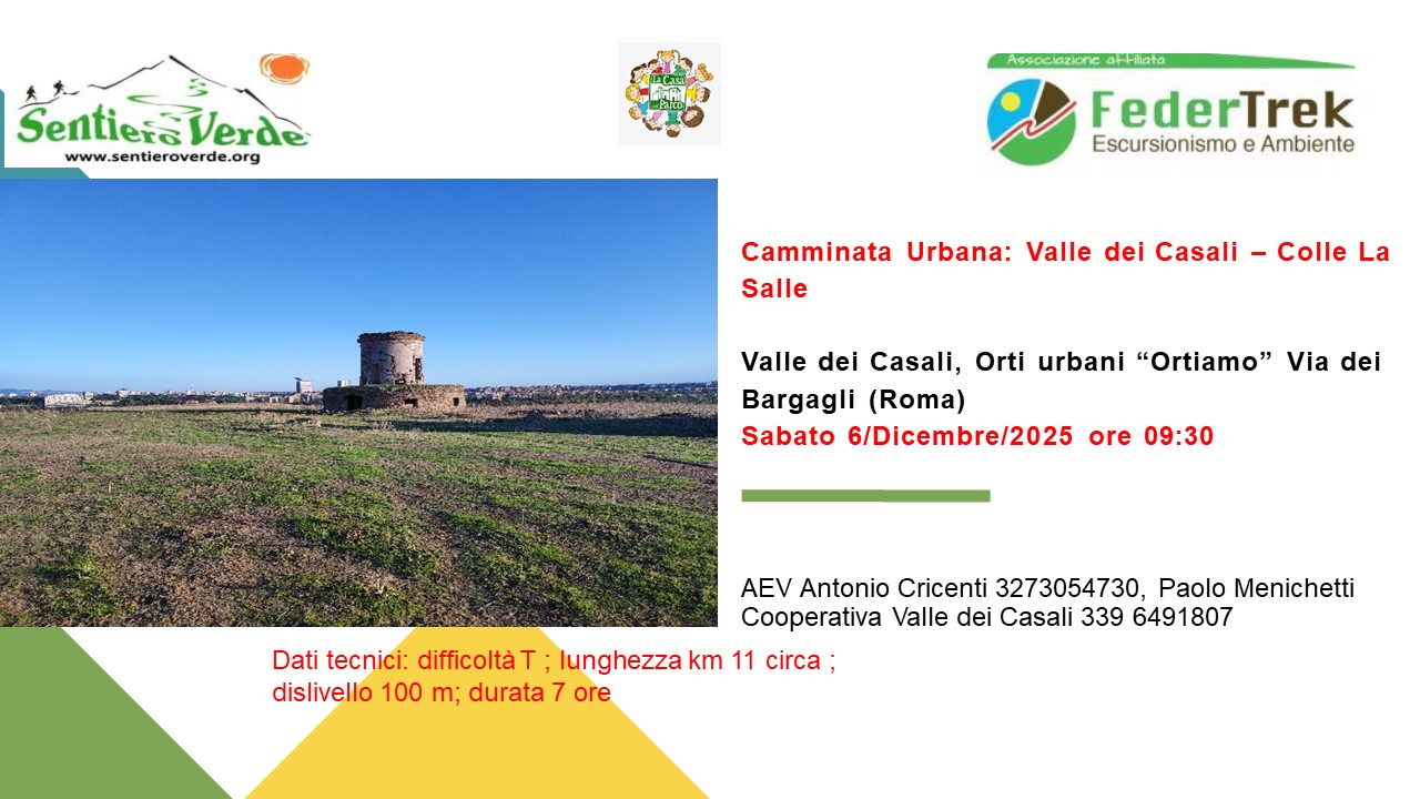 Escursione storico-naturalistica sulla campagna urbana della Valle dei Casali, dalla Via Portuense al Colle panoramico de La Salle. L’area ricade nel XI municipio e mostra una pianura costellata di bassi terrazzi fluviali e collinette. Di particolare rilievo è il coesistere dei quartieri del Portuense e del Trullo, con le piccole aree boschive con alberi ad alto fusto e una piccola sughereta. Faremo una sosta presso un tipico bar di quartiere a Monte delle Capre. Arriveremo alla Collina de La Salle, un belvedere sulla parte sud di Roma, per consumare il pranzo al sacco e successivo rientro alle macchine.